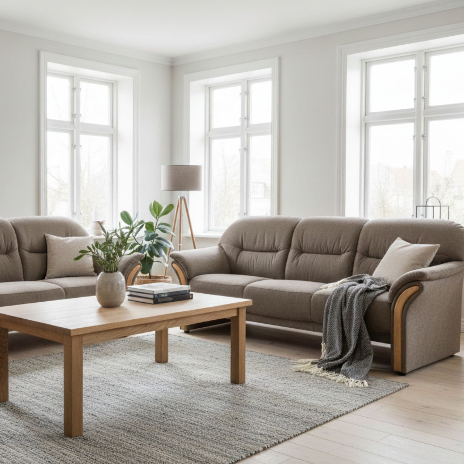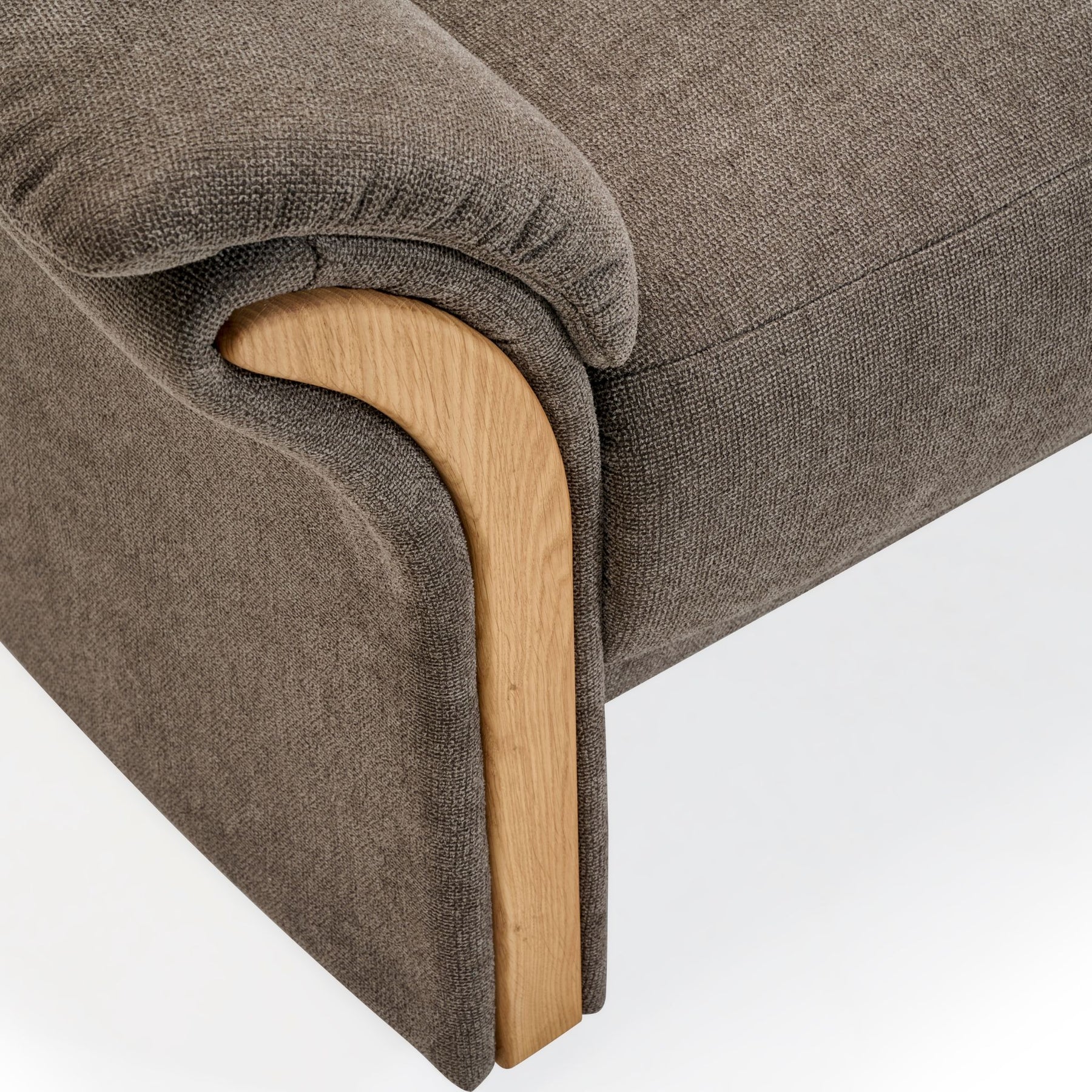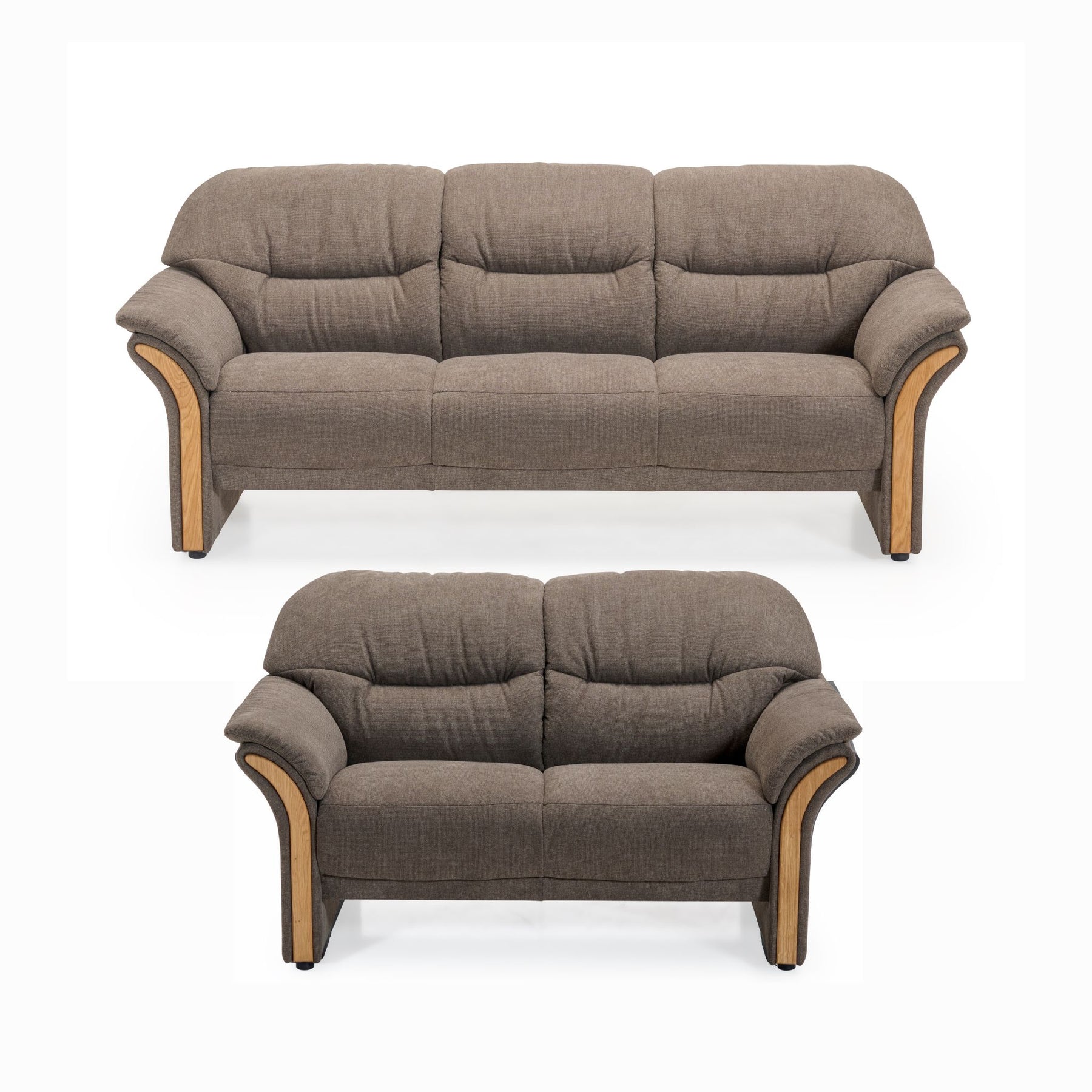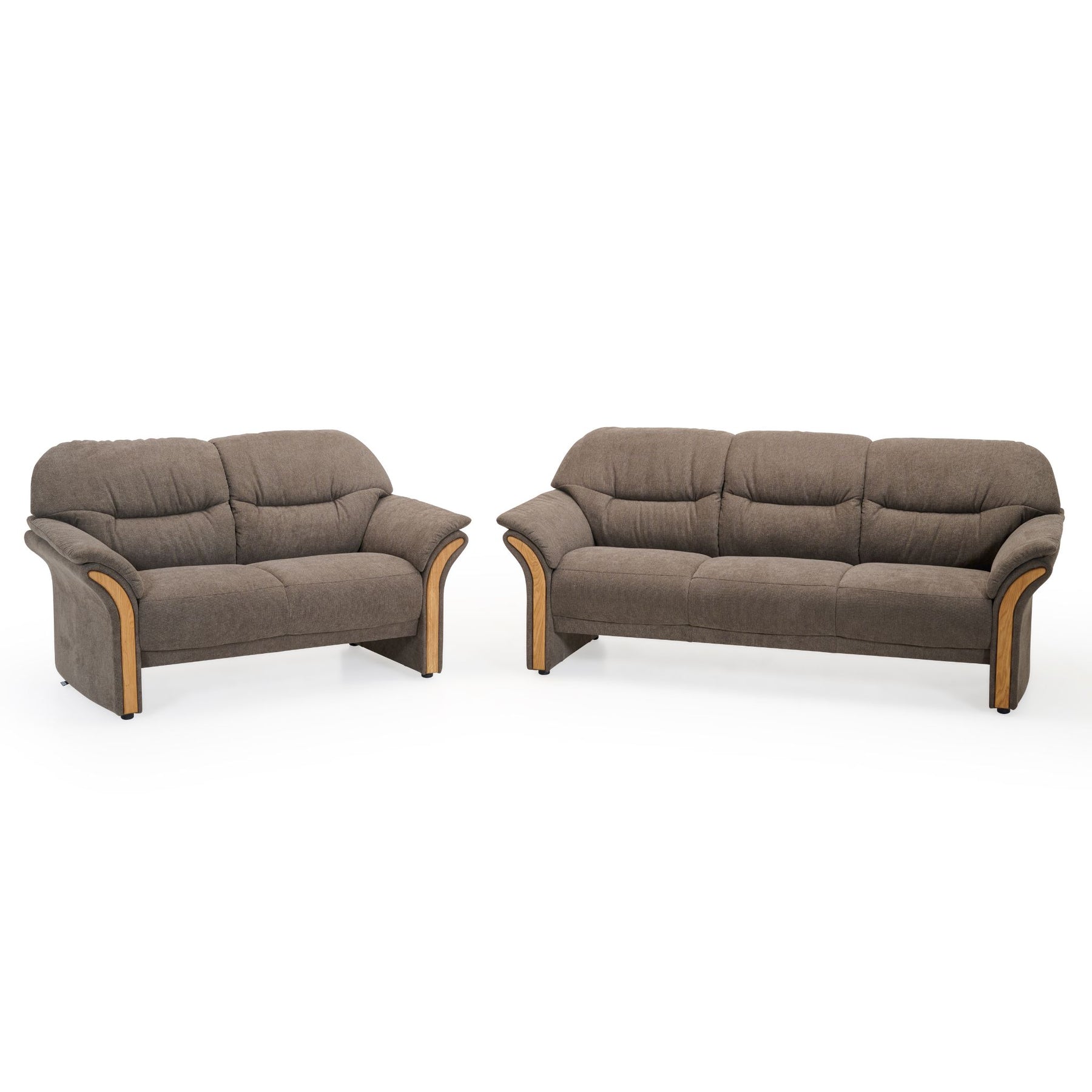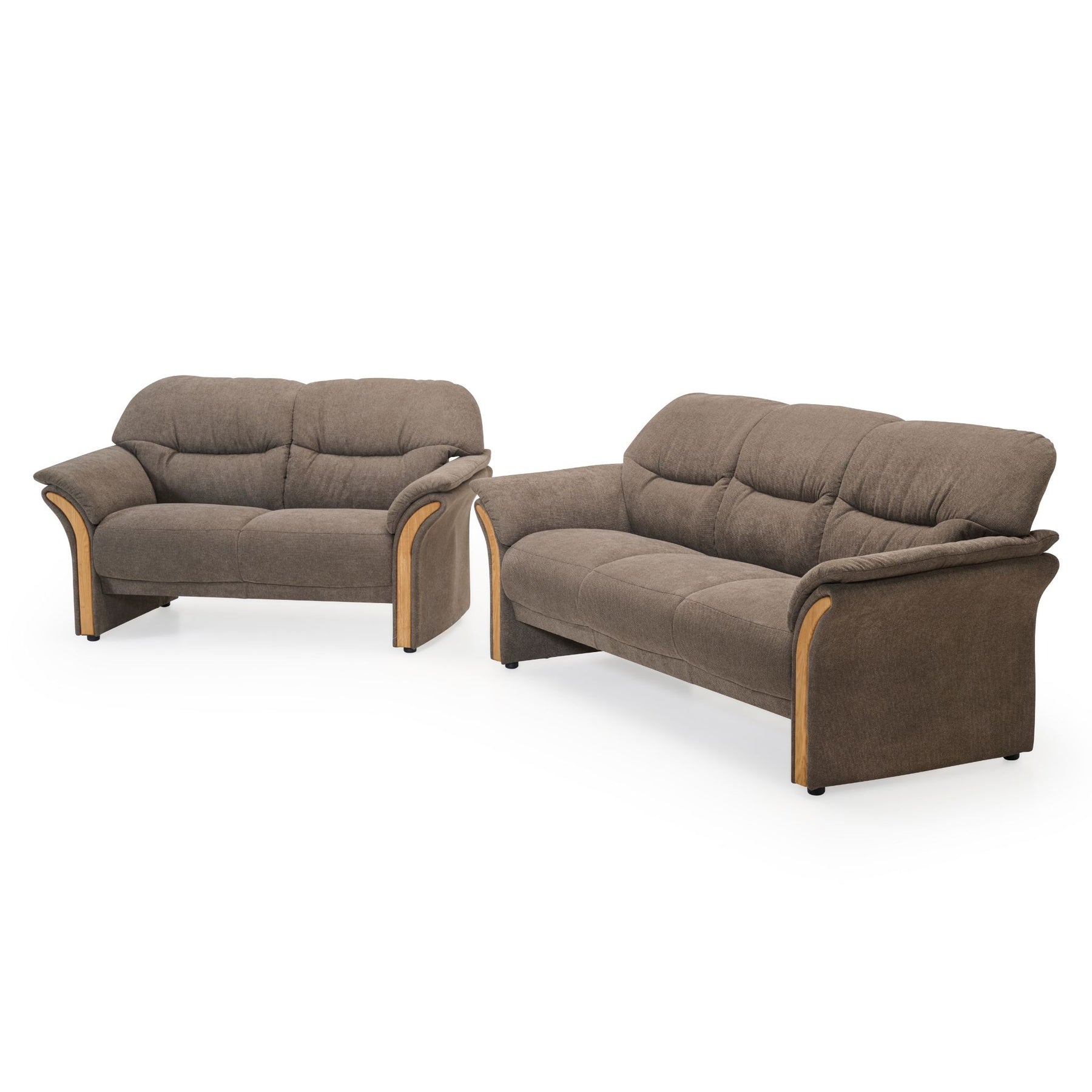 De bløde sæder er betrukket med Bloq stof i en flot brun farve, som både er slidstærkt og indbydende i udtrykket. Sofaerne kommer med let buede armlæn med træbakker i smukt olieret egetræ, hvilket sætter et naturoligt og varmt præg til designet.