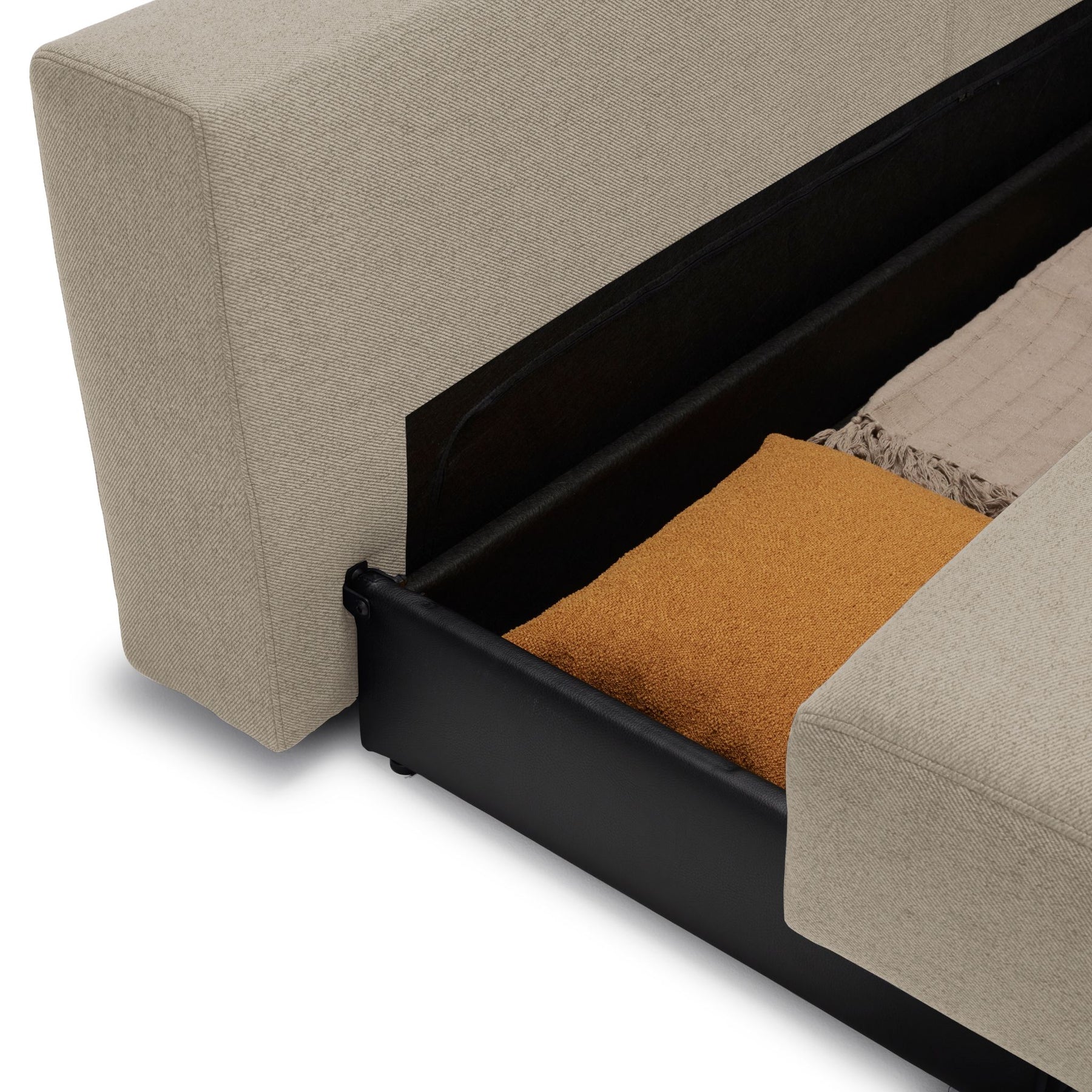 Sovesofaen er let at omdanne fra sofa til seng, og du kan bruge den som både enkeltmandsseng og dobbeltseng. Under sengen finder du et praktisk opbevaringsmagasin, der muliggør at gemme dyner, puder og sengelinned væk om dagen - helt perfekt til at holde dit rum organiseret og indbydende.